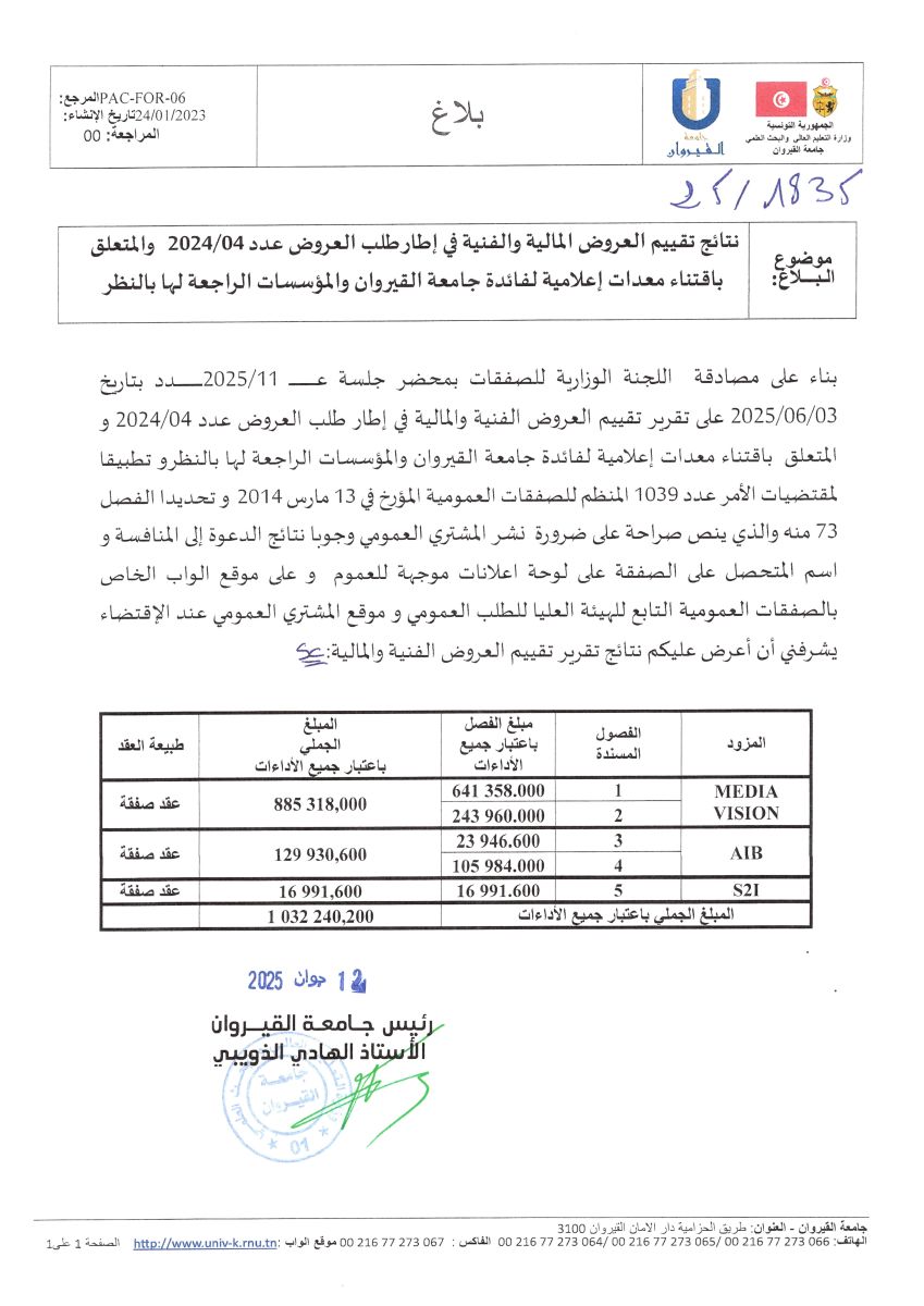 نتائج تقييم العروض المالية والفنية في إطار طلب العروض عدد 04/2024   والمتعلق باقتناء معدات إعلامية لفائدة جامعة القيروان والمؤسسات الراجعة لها بالنظر