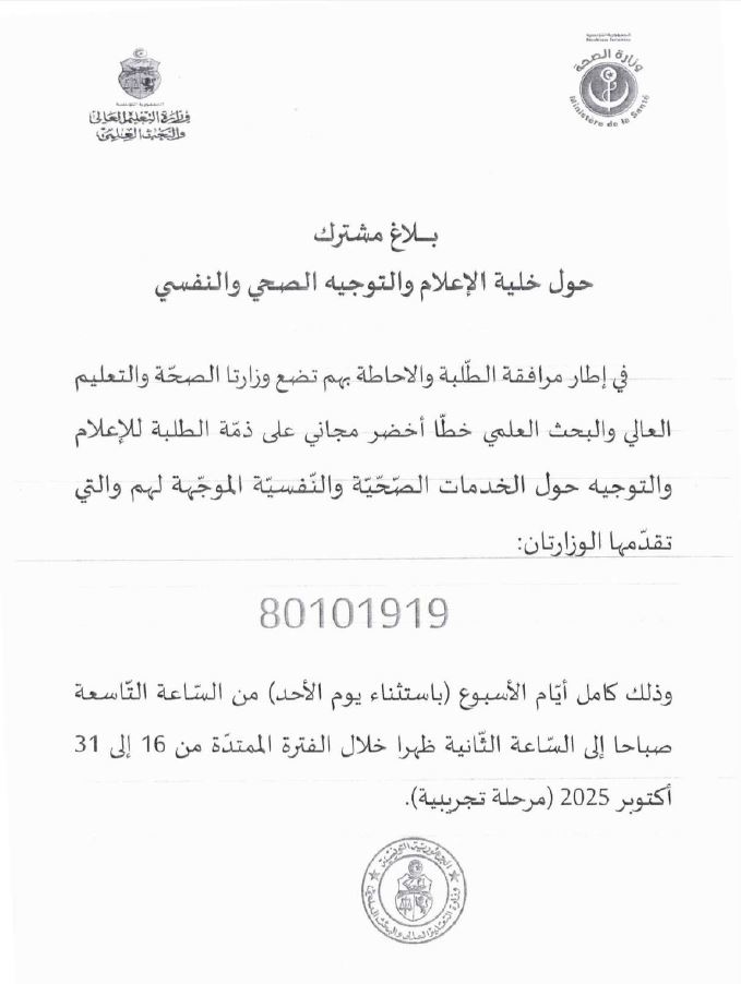 بلاغ مشترك حول خلية الإعلام و التوجيه الصحي و النفسي
