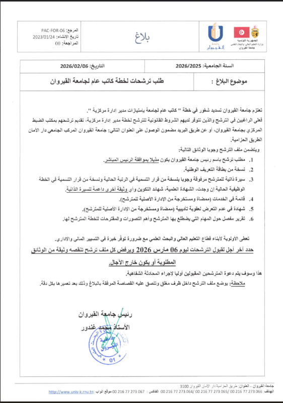 بلاغ طلب ترشحات لخطة كاتب عام لجامعة القيروان