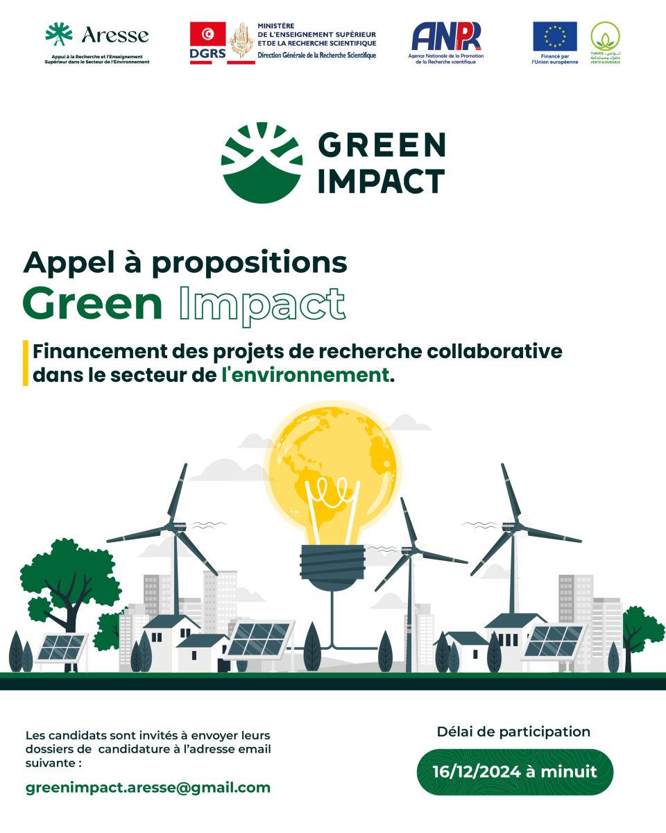 Dans le cadre du projet d’Appui à la Recherche et l’Enseignement Supérieur dans le Secteur de l’Environnement « ARESSE », financé par l’Union européenne dans le cadre du programme « Tunisie verte et durable », l'Agence Nationale de la Promotion de la Recherche scientifique (ANPR) et la Direction Générale de la Recherche Scientifique (DGRS) lancent l’appel à propositions « Green Impact » qui vise à soutenir des projets collaboratifs innovants et à fort impact dans le domaine de l'environnement.
